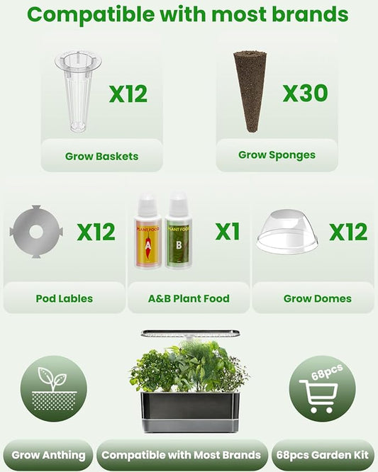 inbloom Grow Anything Seed Pod Kit for AeroGarden, Ahopegarden, GARDENCUBE, iDoo, MUFGA Hydroponic Growing System, 68 Pcs Indoor Garden Supply with 30 Grow Sponges, 12 Baskets, 12 Domes and 12 Labels