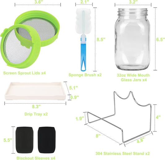 Complete Sprouting Jar Kit| 2 Wide Mouth Mason Jars, 316 Screen Sprout Lids, Blackout Sleeves, Tray, Stand| Sprouter Set for Growing Broccoli, Alfalfa and More-Seeds not Included