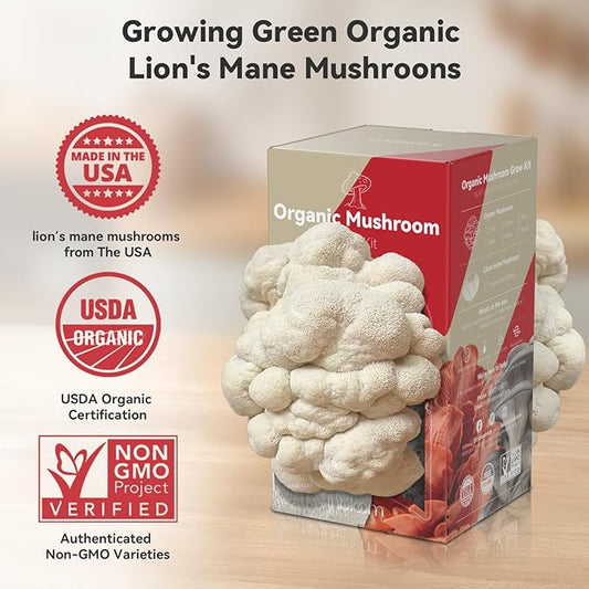 inbloom Double-Side Organic Lion's Mane Mushroom Growing Kit, Non-GMO White Indoor Mushroom Grow Kit (4 lbs), Easy to Use Plump Mushroom Kit Gift for Birthday, USA