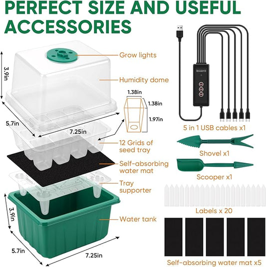 Seed Starter Tray 5 Packs Seedling Starter Trays with Grow Light 8 LEDs, Timer, Dimmable, Seed Starting Trays Kit with Humidity Dome (60 Cells) Indoor Gardening Plant Germination Tray