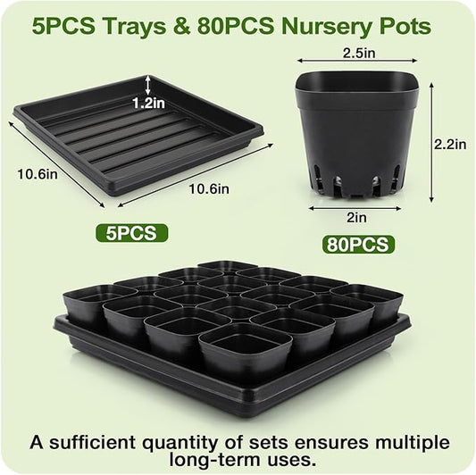 80Pcs 2.5inch Square Nursery Pots with 5Pcs Seed Starting Trays, Seed Starter Tray Kit, Seeds Starting Germination, Seeding Pots with Drain Holes, Small Plant Nursery Propagation