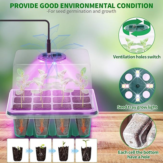 Seed Starter Tray with Plant Light, 4 Pack Grow Lights for Seed Starting Kit with Humidity Domes, Timing Controller Adjustable Brightness for Greenhouse Propagator Station Planting Growing