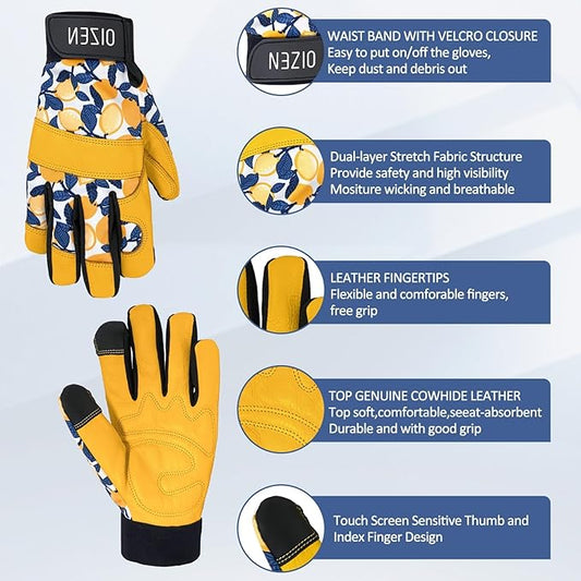 Cowhide Leather Thorn Proof & Puncture Resistant Gardening Gloves for Women and Men, Touchscreen Compatible Working Gloves for Weeding, Digging, Planting, Gardening Gifts for Women, Size Medium