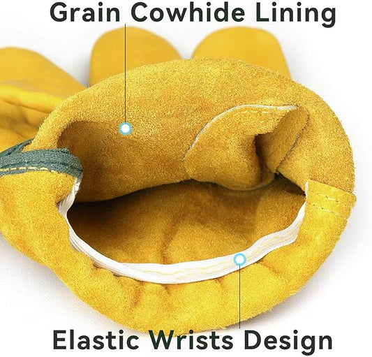 OZERO Leather Work Gloves Flex Grip Tough Cowhide Gardening Glove for Wood Cutting/Construction/Driving/Garden for Men and Women 1 Pair (Gold,Large)