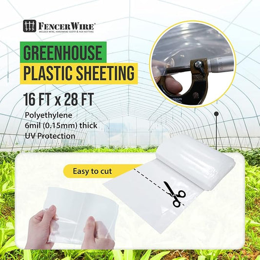 Fencer Wire 6 mil Clear Greenhouse Plastic Sheeting UV Resistant Polyethylene Greenhouse Film, Hoop House Cover for Horticulture, Gardening, Farming and Agriculture 90% Light Transmittance, 16’ x 28’