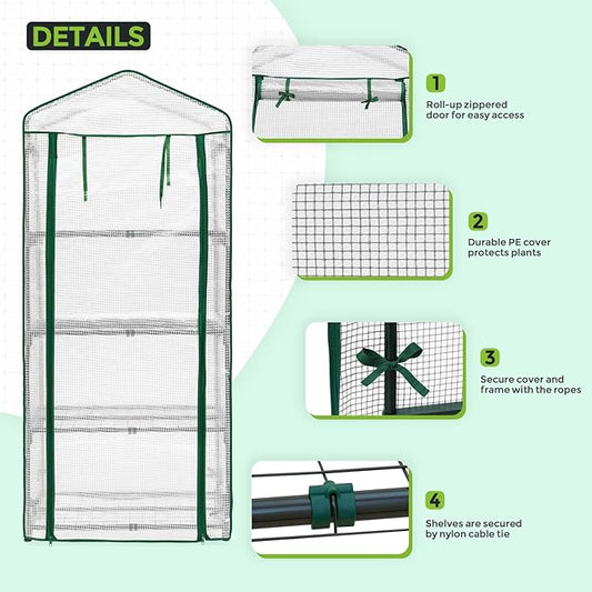 EAGLE PEAK Mini Greenhouse with Wire Shelves, Portable Indoor & Outdoor Green House with Roll-Up Zipper Door, 4 Tier, 31.5”x17.7”x63.0”, Green PE Cover
