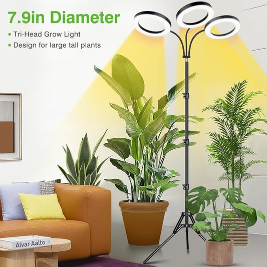 LORDEM Grow Light for Indoor Plants, 7.9" Diameter Tri-Head Plant Light for Plants Growing, Full Spectrum Growth Lamp with Auto Timer 3/6/12H, 4 Dimmable Levels, 3 Lighting Modes, Adjustable Stand