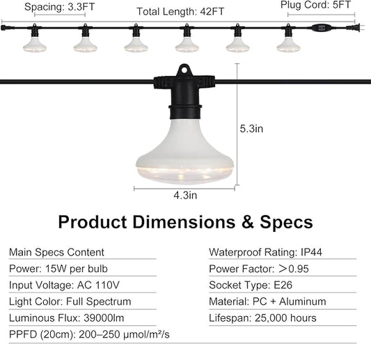 Outdoor Grow Lights Waterproof, Full Spectrum String Grow Light with 22FT Light String Cord for Seedling, Veg, Flower in Greenhouse, Garden, Backyard, Farm (12 Lights, with Smart Plug)