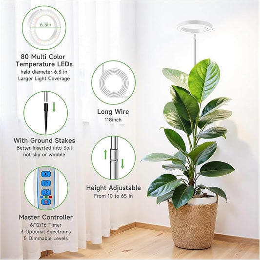 Grow Lights for Indoor Plants, 6000K Full Spectrum Plant Grow Lights, Height Adjustable 10"-65" Growing Lamp, Automatic Timer 6/12/16Hrs, 5-Level Dimmable, Idea for Large Plant, 2 Pack