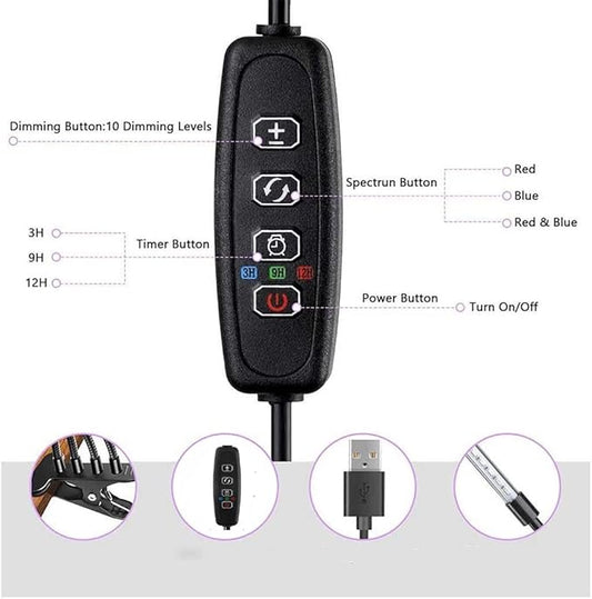 Black 2-Tube Clip-On Grow Light with Red/Blue/Yellow LEDs, Full Spectrum, 6/12/16H Timer, 3 Modes & 10 Dimmable Levels, for Indoor Plants (8W) (2 Pack)