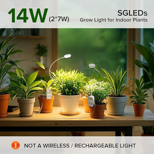 Grow Lights for Indoor Plant Growing, 2 Lamp Heads One Plug LED Clip Plant Light, 4000K Full Spectrum 4-Level Dimmable, Auto On Off Timing 3 6 12 Hrs Small Plants, White 14W
