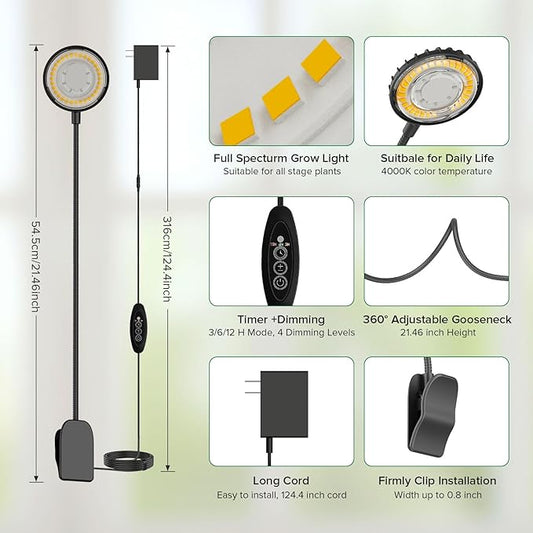 GooingTop Grow Light for Indoor Plants Growing,5000K White Full Spectrum Gooseneck Plant Lamp Clip-on Desk for Pot Plant Seed Starting,Dimmable with Auto Timer