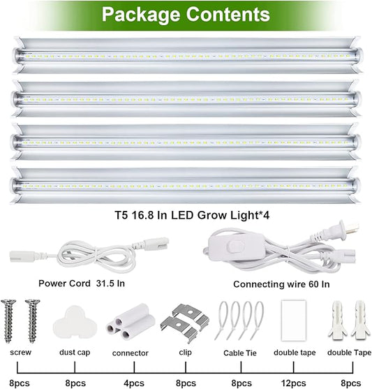 Grow Light T5 1.4 ft (4pcs x 10 Watts),5000K White Full Spectrum LED Lamp Plant Light Strips for Indoor Plant Growing,End-to-End Connectable with V-Shaped Reflector