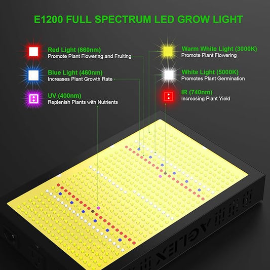 AGLEX E1200 LED Grow Light, Full Spectrum Grow Light with UV IR Diode, Grow Lights for Indoor Plants with Daisy Chain & Built-in Silent Fan, Plant Growing Lamps for 2x2 FT Coverage