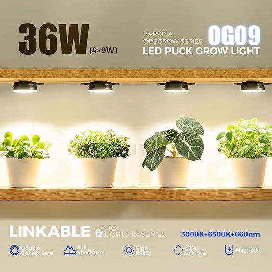 Barrina Orbgrow OG09 Puck LED Grow Light, 5000K 36W(4 x 9W, 540 Watt Equiv), Plant Lights for Indoor Plants Full Spectrum, Magnetic & Linkable, Small Grow lamp, Perfect for Plant Shelf, 4 Packs, Black