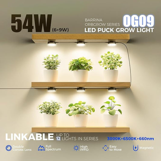 Barrina Orbgrow OG09 Puck Grow Light, 5000K 54W(6 x 9W, 810 Watt Equiv), Full Spectrum Plant Light for Indoor Plants, Magnetic & Linkable with Timer, 5 Levels Dimmable for Plant Shelf, 6 Packs, Black