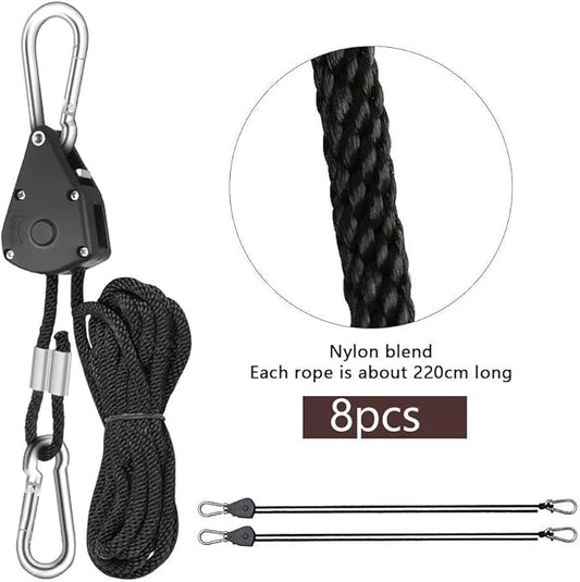 4 Pairs 1/8 Inch Adjustable Heavy Duty Ratchet Hanger Grow Light Fixtures Rope Clip Hangers Hanging Ropes for Gardening Grow Plant Fan Reflectors Filter Tent,150lbs Weight Capacity