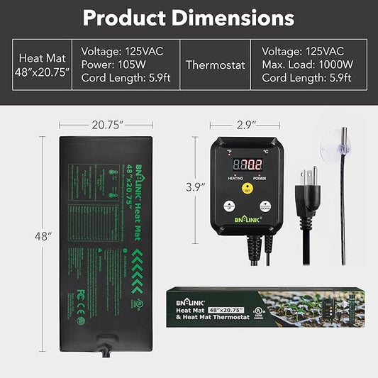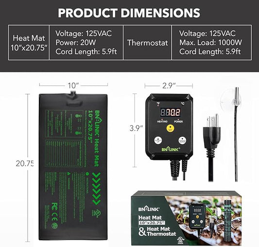 BN-LINK Seedling Heat Mat with Thermostat Controller Combo Set, 10" x 20.75" Plant Heating Mat for Seed Starting with Temperature Control for Indoor Growing, Plants Germination