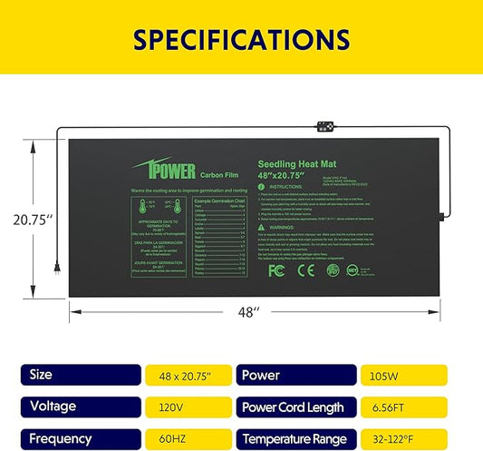 iPower GLHTMTL-A 48" x 20" Waterproof Durable Seedling Heat Mat Warm Hydroponic Plant for Indoor Gardening Germination Starting, Black