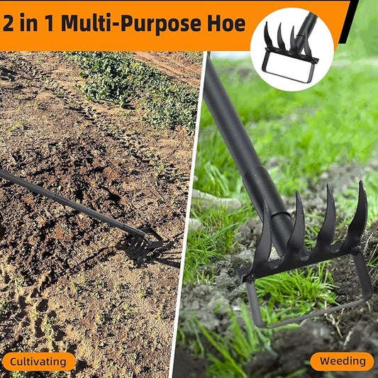 Garden Hoe Stirrup Hoe Weeding Tools, 2-in-1 Garden Hoe for Weeding with 62.6" Adjustable Handle, Heavy Duty Gardening Tools with 4 Tines for Weeding, Loosening, Digging and Cultivation