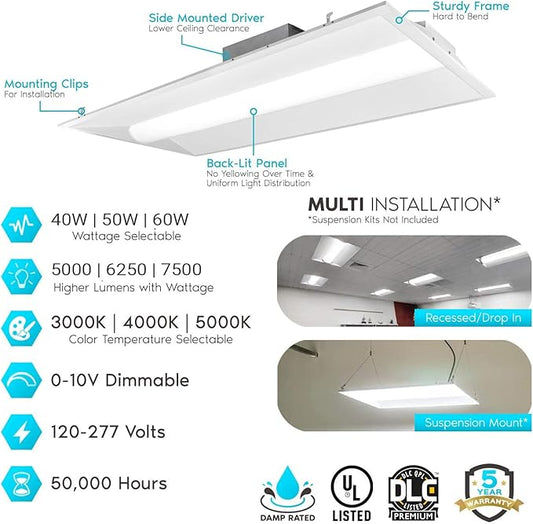 2X2 FT Center LED Troffer Panel Light, 20/30/40W, 3 Color Options 3000K | 4000K | 5000K, Dimmable Drop Ceiling Lights, 2500/3750/5000 Lumens, Damp Rated, 120-277V, DLC Premium (12 Pack)