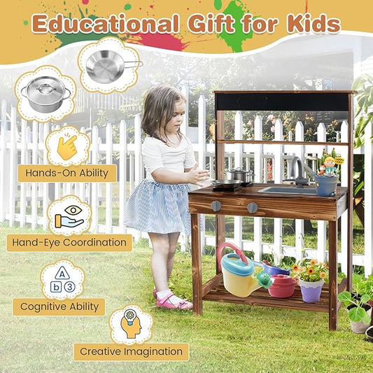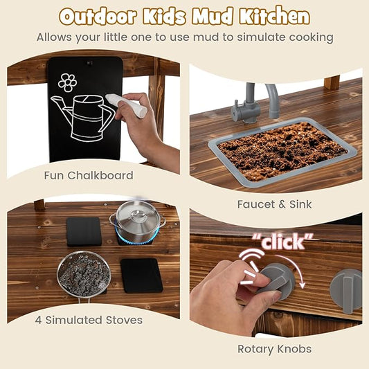 HONEY JOY Mud Kitchen, Fir Wood Outdoor Play Kitchen for Toddlers, Realistic Faucet & Garden Sink, Stoves, Chalkboard, Storage Shelf, Outdoor Kitchen Playset, Mud Kitchen for Kids Outdoor Backyard