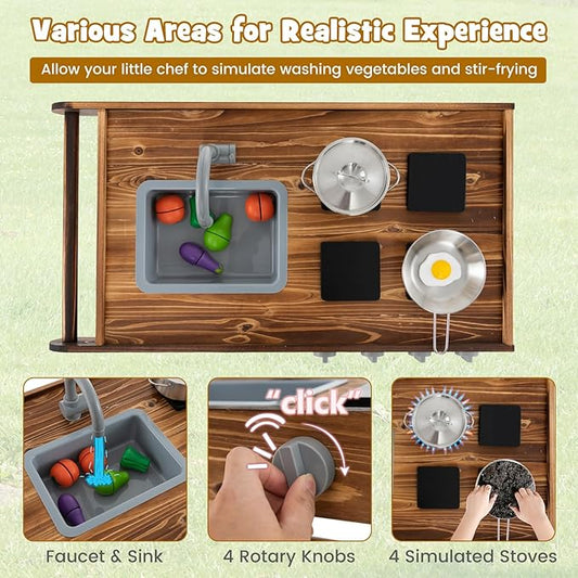 Honey Joy Mud Kitchen with Wheels - Fir Wood Outdoor Play Kitchen for Toddlers, Garden Sink, Stoves, Storage Shelf, Kids Outdoor Backyard Kitchen Playset