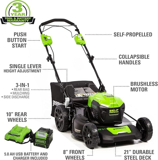 Greenworks 40V 21" Self-Propelled Lawn Mower,Axial Leaf Blower(500 CFM / 120 MPH),13" String Trimmer, 160 PSI Portable Tire Inflator, Includes 2 Batteries(5Ah+2Ah) & Chargers
