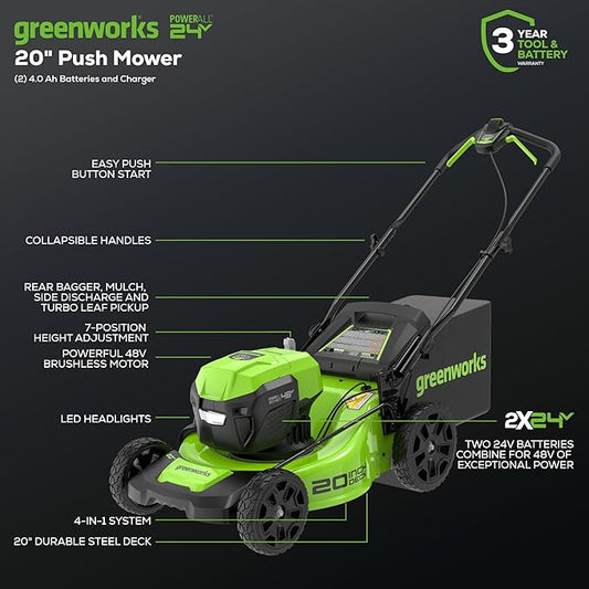 Greenworks 48V (2 x 24V) 20" Brushless Cordless (Push) Lawn Mower (LED Headlight), (2) 4.0Ah Batteries and Dual Port Rapid Charger Included (125+ Compatible Tools)