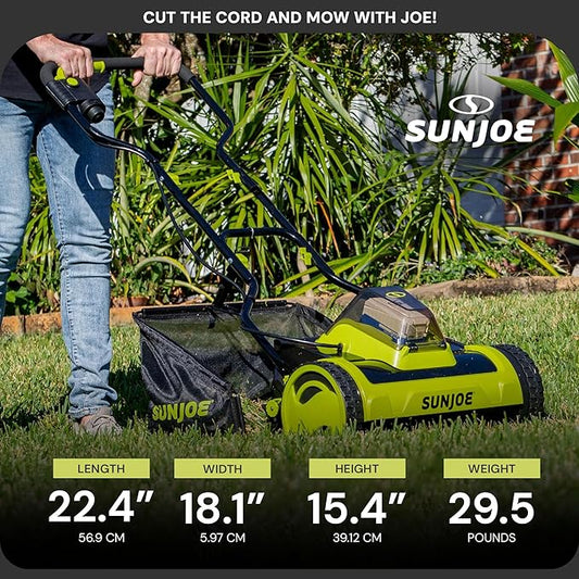 Sun Joe Cordless Push Reel Lawn Mower, 15” Yard Trimmer w/ 11.9-Gal Bag, 24V, Black/Green - Heavy-Duty Gardening Machine and Equipment for Grass, Backyard, Garden, and Patio
