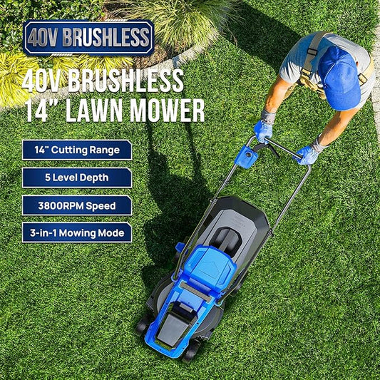 Wild Badger Power Electric Lawn Mower 40V Brushless 14" Cordless&Push, 5 Cutting Height Adjustment, 4Ah Battery and Super Charger, Blue