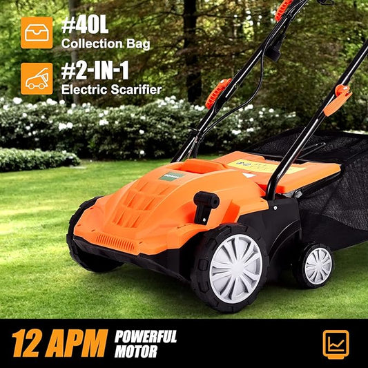 ARNOT Lawn Dethatcher & Scarifier, 2-in-1 Electric Corded Lawn Dethatcher, 13-Inch 12Amp Lawn Scarifier, 3-Position Raking Depth, w/40L Collection Bag & 2 Removable Blades, Orange