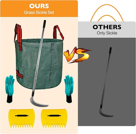 Sickle Garden Tool Set, Long Handle Weeding Sickle with Serrated Double-Edged Blade, Grass Sickle Stand Up Weeding Tool with 2 Pack Leaf Scoops, 16 Gallon Lawn Bag with Gardening Gloves for Yard