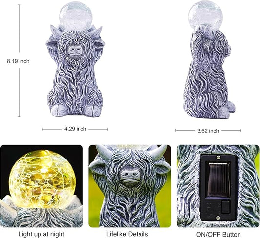 Goodeco Highland Cow with Solar Gazing Ball Lights – 8.2 Inch Garden Statue for Home & Outdoor Decor, Highland Cow Gifts for Yard & Patio (Gray)