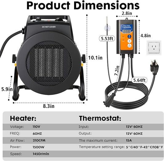 Greenhouse Heater with Digital Thermostat, 1500W/750W Electric Grow Tent Heaters, 3S PTC Fast Heating, 3 Modes Adjustment, Overheat Protection for Patio, Grow Tent, Greenhouse, Outdoor, YE