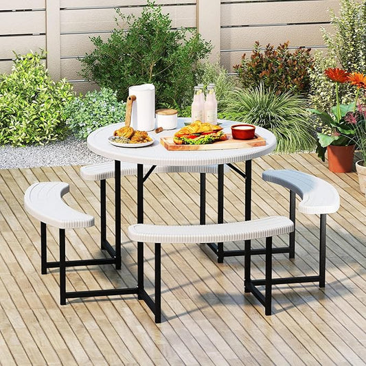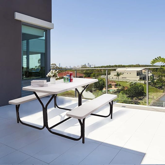 Moccha Picnic Table Bench Set - Portable Plastic Picnic Table w/Steel Frame & Wood-Like Texture, All Weather Heavy Duty Picnic Table Kit, Picnic Tables for Outdoors Garden Patio Party Dining (White)