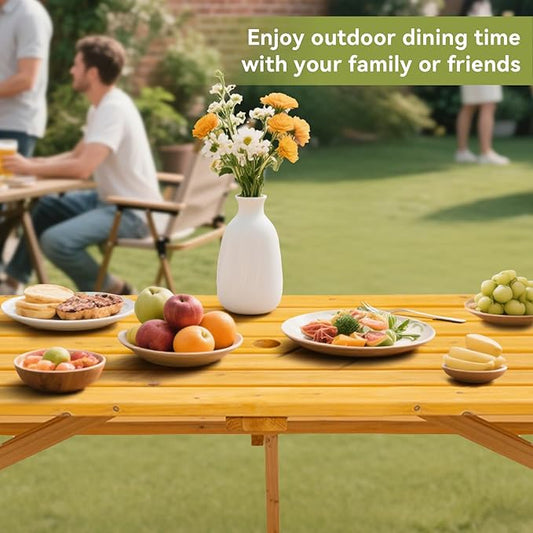 8-Person Wooden Picnic Table with 2 Built-In Benches, 75"L x 50"W Outdoor Dining Table, 2220lb Capacity Includes Umbrella Hole & Weather-Resistant Finish, Perfect for Backyard, Camping, Yellow