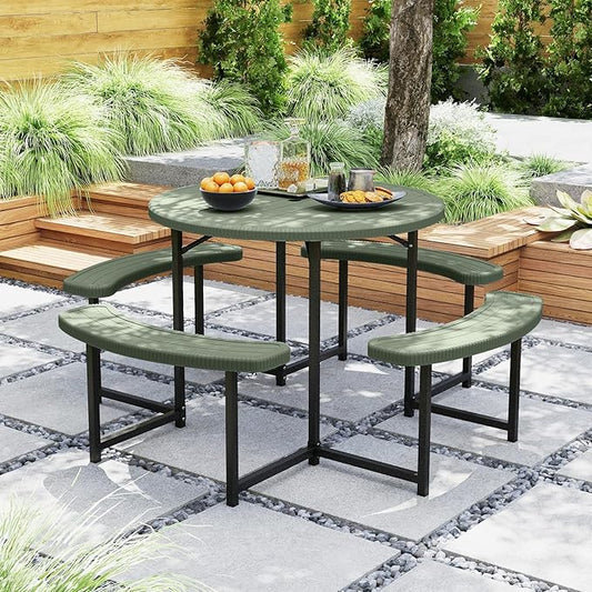 Giantex Picnic Table Bench Set for 4-8 Person, Round 37” Outdoor Dining Table w/Umbrella Hole, HDPE Tabletop, Metal Frame, Patio Furniture Set for Backyard Porch Lawn, 1400lb Capacity (Green,Round)