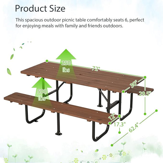 Picnic Table with Bench for 6-8 Person Outdoor Wooden Rectangle Table for Backyard, Porch, Patio, Deck w/Umbrella Hole -Brown