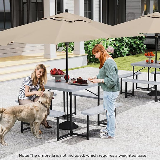 Giantex Picnic Table Bench Set for 4-8 People, 34" Outdoor Square Dining Table & 2 Benches w/Umbrella Hole, HDPE Tabletop, Metal Frame, Patio Camping Furniture for Backyard Porch Lawn (Grey,Square)