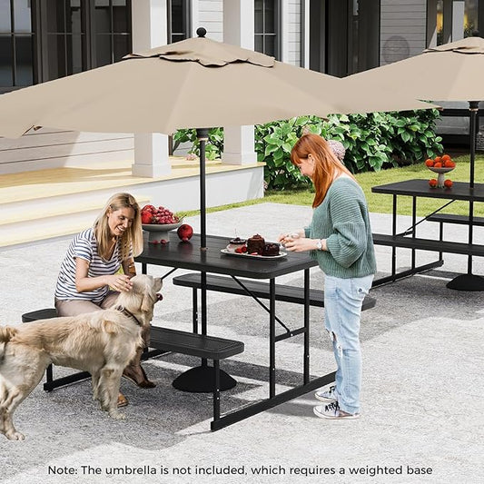 Tangkula Picnic Table, HDPE Outdoor Rectangular Table Bench Set with 2 Built-in Benches, Umbrella Hole, Metal Frame for 4 Person, Garden Yard Patio Lawn