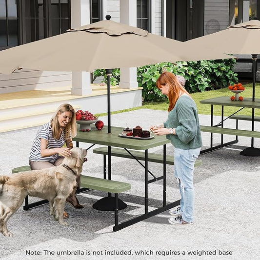 Moccha Picnic Table Bench Set - Portable Plastic Picnic Table w/Steel Frame & Wood-Like Texture, All Weather Heavy Duty Picnic Table Kit, Picnic Tables for Outdoors Garden Patio Party Dining (Green)