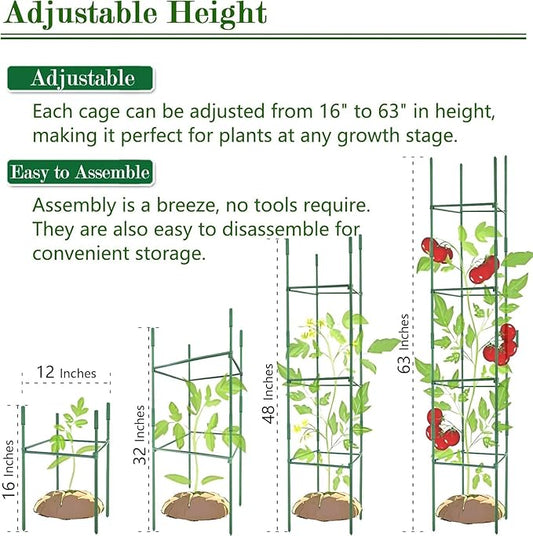 3Pack 12" Width Up to 48" Height Adjustable Square Tomato Cages for Garden, Plant Support Stakes for Climbing Vegetable, Tomatoe, Flower, with Twist Ties Snap-On Stake Arms