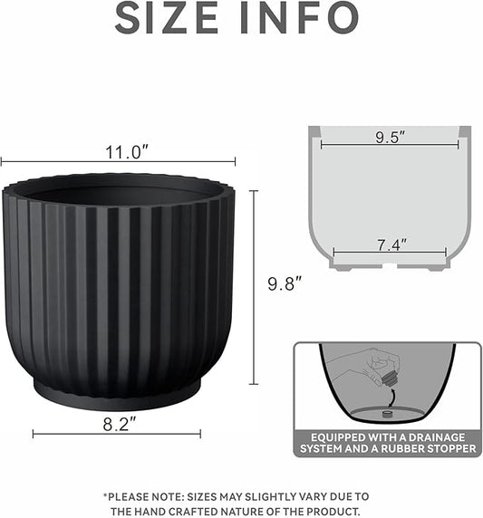Kante Round Fulted Planter, 11 Inch Dia Large Concrete Plant Pots with Drainage Hole and Rubber Plug, Modern Decor for Indoor Outdoor Plants, Flower, Black