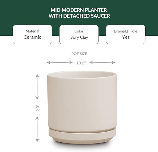 Ceramic Mid Modern Planter Pots with Detached Saucer - Indoor/Outdoor Plant Pots with Drainage Hole