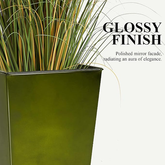 Worth Garden 25" Large Metal Glazed Planter Set of 2, Luxurious Glossy Finish Green Tall Square Tapered Steel Plant Pots, Decor Flower Pot Indoor & Outdoor, Drainage Hole & Dual-Purpose Plant Saucer