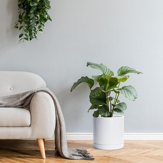 D'vine Dev 10 Inch Ceramic Planter Pot with Drainage Hole and Saucer, Indoor Cylinder Round Planter Pot, White, 94-O-E-1