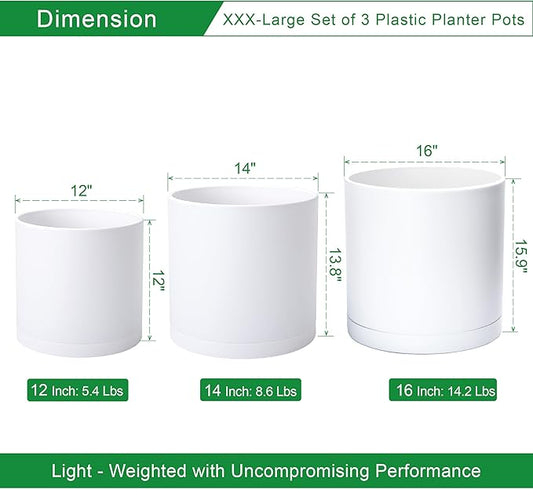 D'vine Dev 12 Inch 14 Inch 16 Inch, Set of 3 Plastic Planter Pots for Plants with Drainage Hole and Seamless Saucers, White Color, XXX-Large, 74-V-A-7