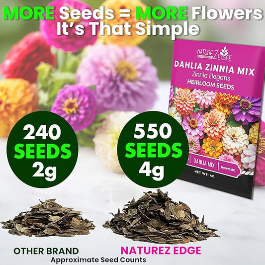 NatureZ Edge Zinnia Seeds for 2025 Planting Outdoors, Over 550 Flower Seeds, 4g, Non GMO Made in USA, Bulk Semillas De Flores para Sembrar, Dahlia Mix, Easy to Grow Zinnia Seed Mix