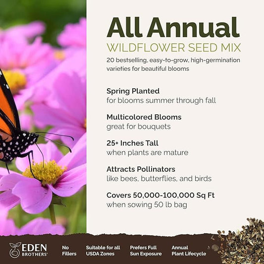 Eden Brothers All Annual Wildflower Mixed Seeds for Planting, 50 lb, 24,000,000+ Seeds with Sunflower, Indian Blanket | Attracts Pollinators, Plant in Spring or Fall, Zones 3, 4, 5, 6, 7, 8, 9, 10